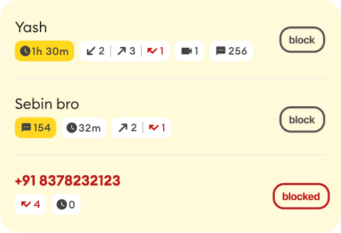 Gain insights into your child's most contacted friends on calls, SMS and Whatsapp and keep unwanted contacts at bay.